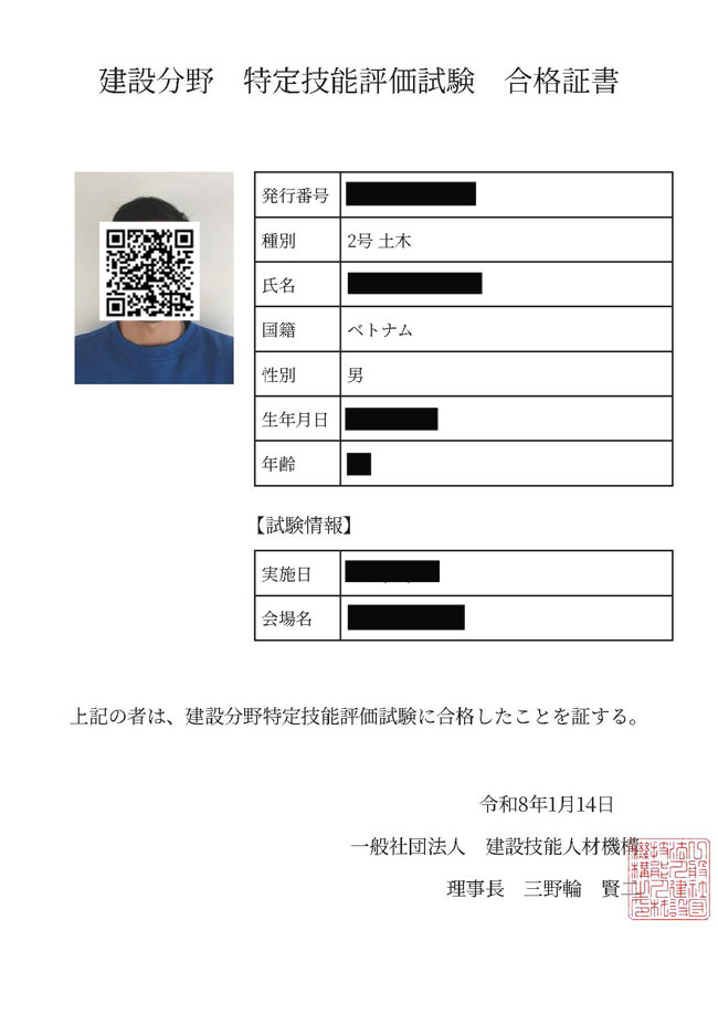 弊社1期生のニ●●トさんが特定技能2号合格しました。おめでとうございます。