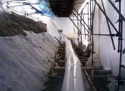 北ふ頭−7.5m岸壁は桟橋式上部工(1スパン)の施工が終了し、西港区勇払−10m岸壁での鋼管矢板(Φ1.3m)の施工が終わり当社担当の上部工の施工を行っています。Φ1.3mの鋼管矢板の上部に幅3.6m高さ2.9m長さ約10.0m(3スパン)のコンクリートを作ります。鋼管矢板の前面から張り出すコンクリートが約1.8m有り、それを支保工で支えます。そこはもちろん海です。ここでも当社独自の技術(特許申請中)を活かして2スパンコンクリートを打設終了しました。
